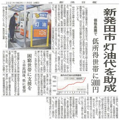 新発田市灯油代助成の記事で取材を受けました(新潟日報) 2021.11.11 お知らせ 新潟日報にて、新発田市の灯油購入費助成に関する記事で、テレビでも取材を受けたオートピア店長の写真が掲載されました。 ↑タップして拡大